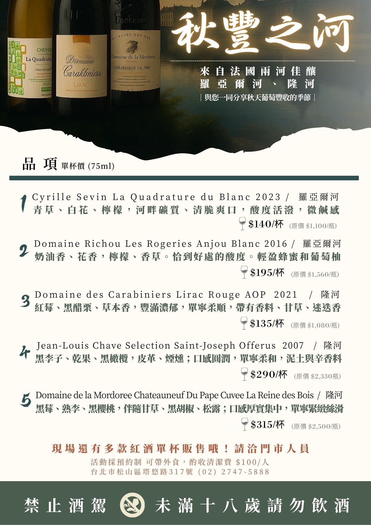 十月,歡迎來位於基隆河畔的吉悅酒窖,品嚐精選來自隆河、羅亞爾河產區的葡萄酒,與您一同分享秋天葡萄豐收的季節。
